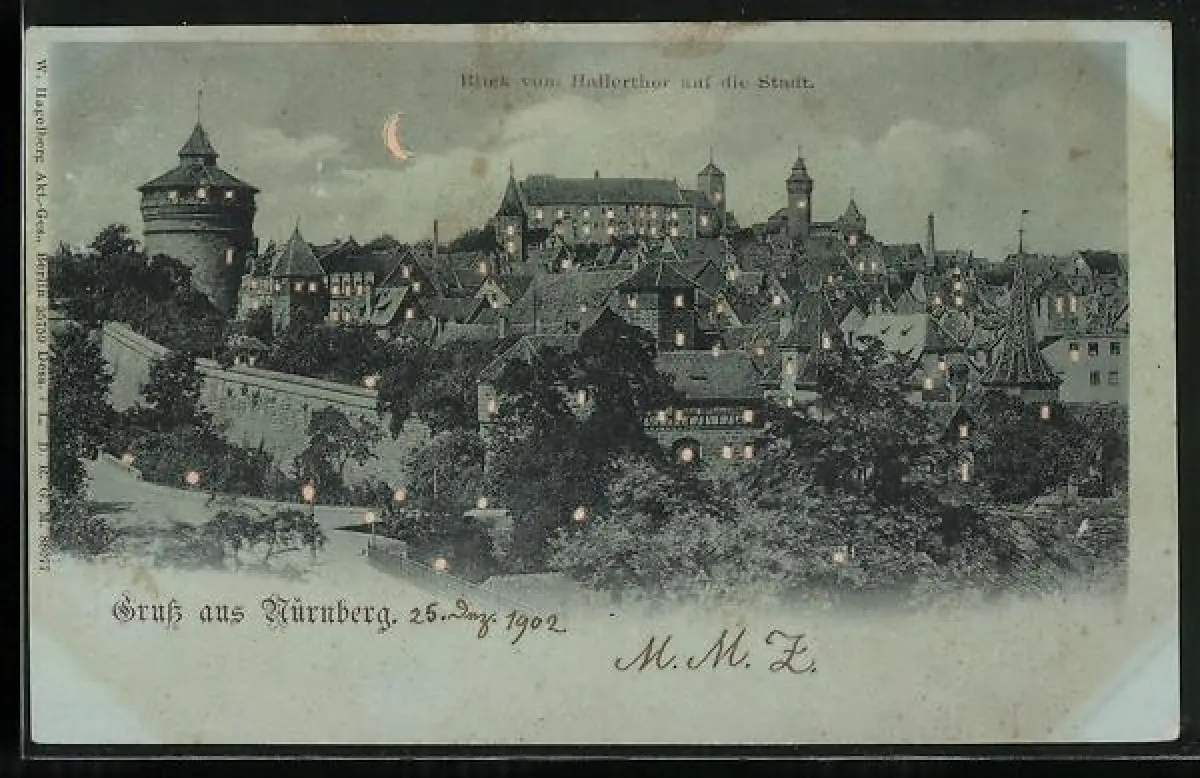 Mondschein-AK Nürnberg, Blick vom Hallerthor auf die Stadt, Halt gegen das Licht