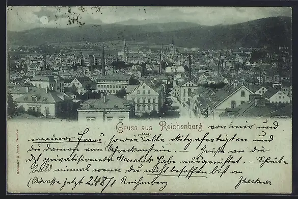 Mondschein-AK Reichenberg, Teilansicht mit Bergpanorama aus der Vogelschau