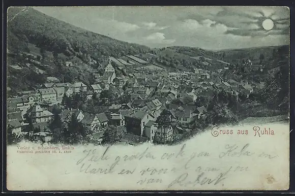 Mondschein-AK Ruhla, Teilansicht mit Bäumen