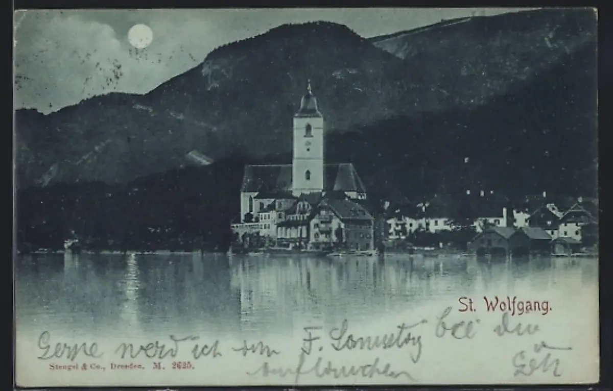 Mondschein-AK St. Wolfgang, Kirche im Vollmondlicht