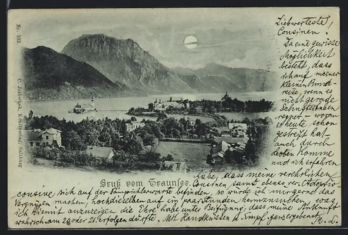 Mondschein-AK Traunsee, Ortsansicht im Vollmondlicht