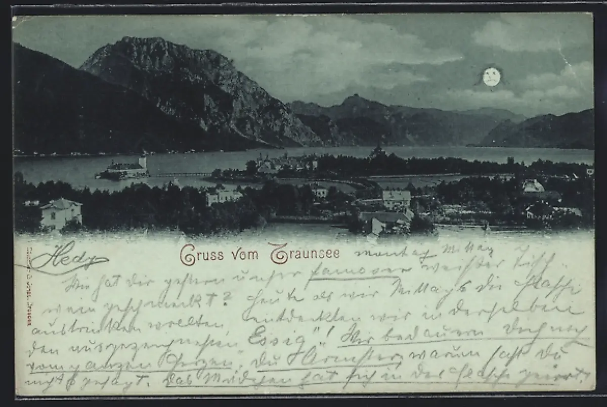 Mondschein-AK Traunsee, Panorama mit Bergen