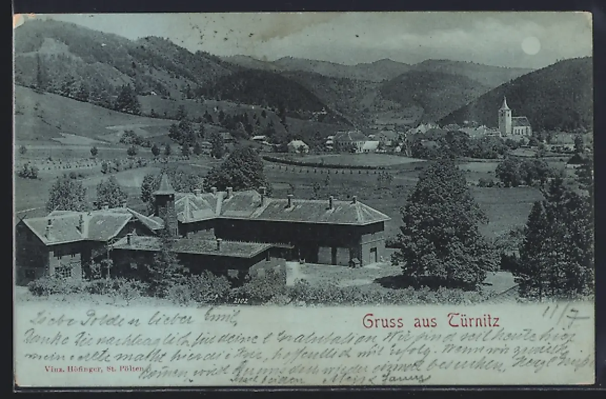 Mondschein-AK Türnitz, Teilansicht mit Bergen aus der Vogelschau