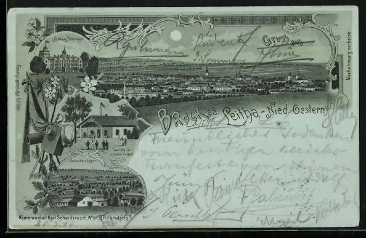 Mondschein-Lithographie Bruck a. d. Leitha, Schloss Harrach, Baracken Lager, Wache im neuen Lager