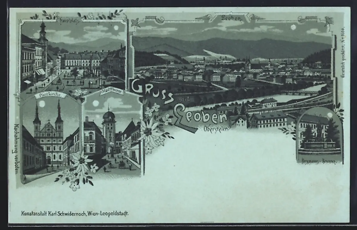 Mondschein-Lithographie Leoben /Obersteier, Pfarrkirche, Hauptplatz, Bergmann-Brunnen, Stadtthurm