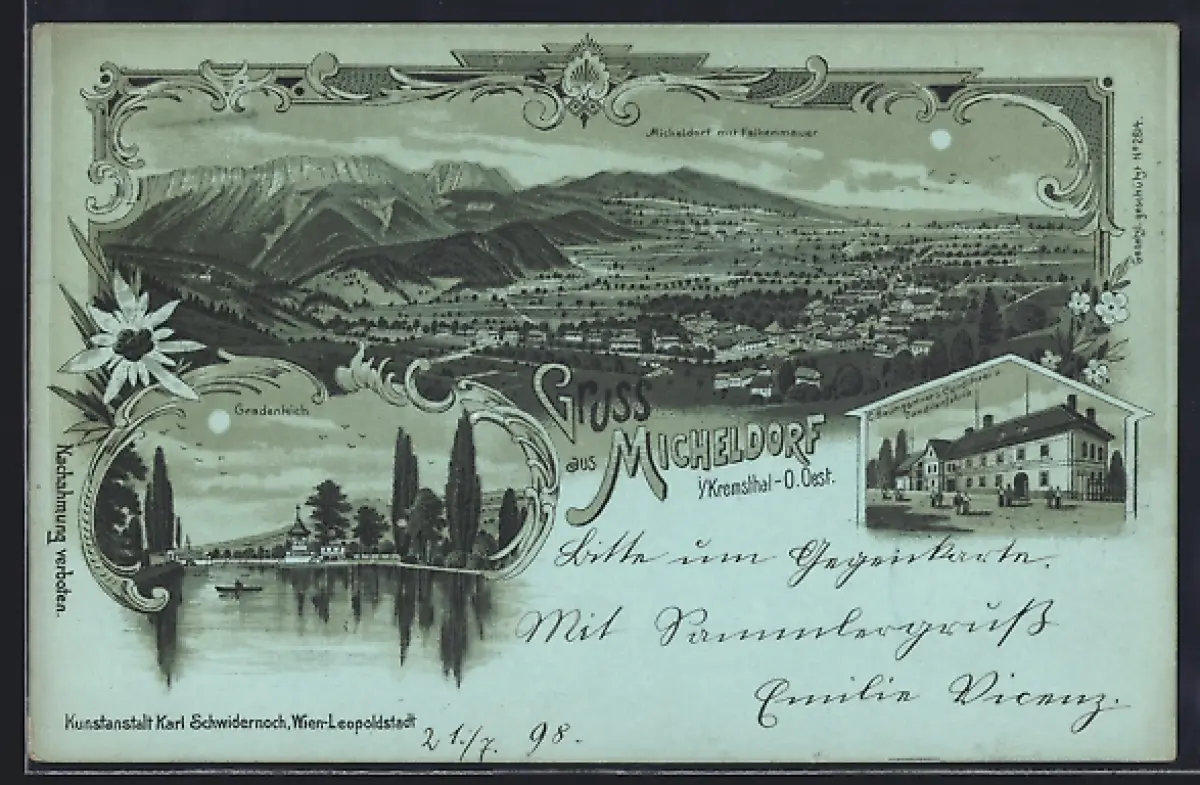 Mondschein-Lithographie Micheldorf im Kremsthal, C. Baumgartners Conditorei u. Canditenfabrik, Gradenteich, Ortsansicht