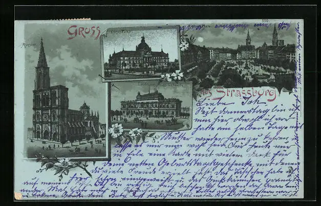 Mondschein-Lithographie Strassburg i. E., Münster, Kaiser-Palast, Landesausschussgebäude, Kleberplatz