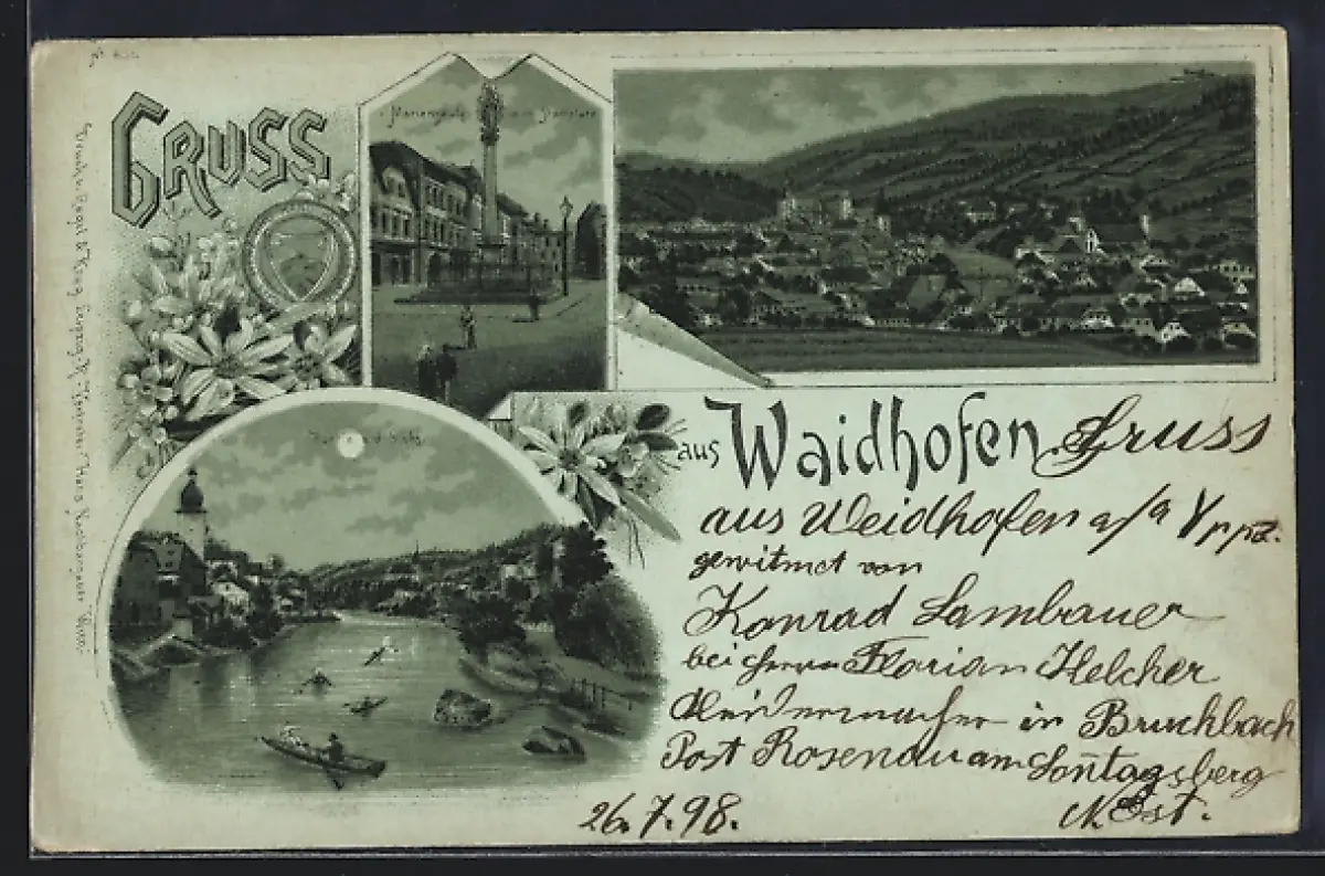 Mondschein-Lithographie Waidhofen, Mariensäule am ob. Stadtplatz, Partie a. d. Ybbs, Ortsansicht