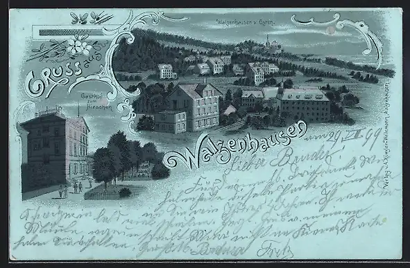 Mondschein-Lithographie Walzenhausen, Gasthof zum Hirschen, Ortsansicht von Osten