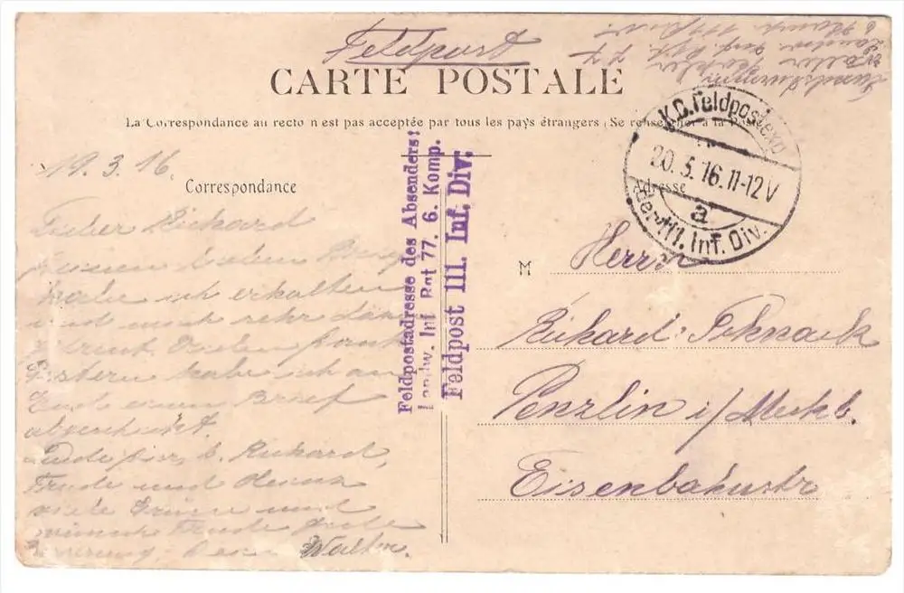 Moyencourt , 1916 , Rue d` Hombleux , Feldpost , Landwehr Inf. Rgt 77 , 6. Kompanie , 111 Inf. Division , Landsturm !!!