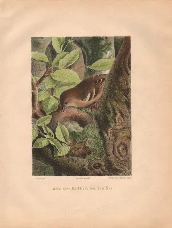 Müller, Adolf / Mützel, G. / Deiker, C.F. (Illustr.), Weiblicher Buchfink (e) bei dem Nest. (Chromolithographie von 1897)