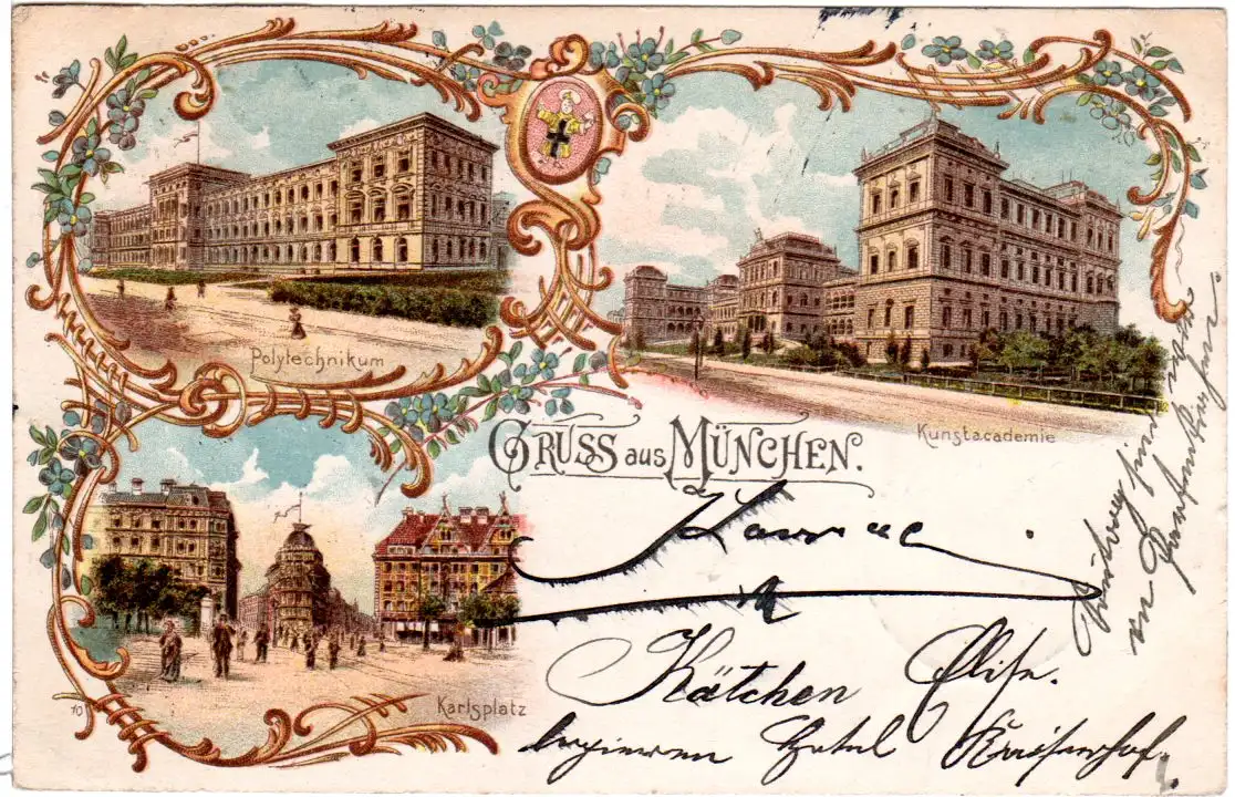 München, Polytechnikum, Kunstakademie u. Karlsplatz, schöne 1900 gebr. Litho-AK
