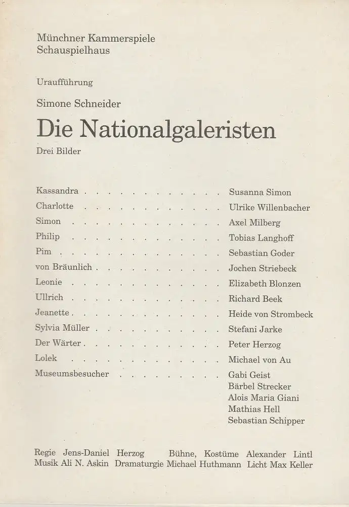 Münchner Kammerspiele, Dieter Dorn, Michael Huthmann, Wolfgang Zimmermann: Programmheft Uraufführung Die Nationalgaleristen von Simone Schneider 8. Oktober 1994 Schauspielhaus.