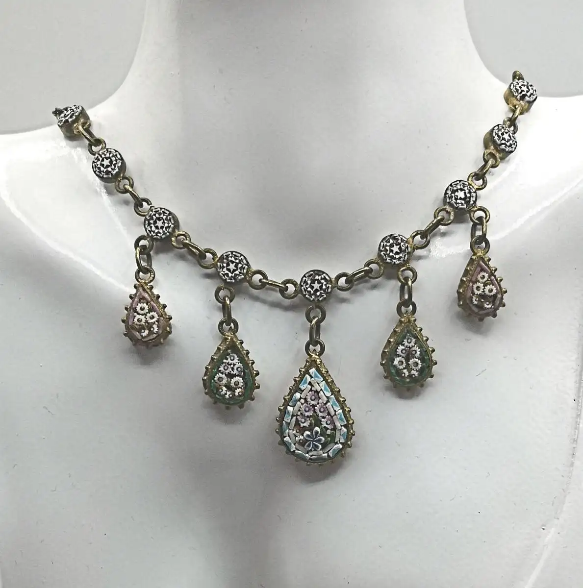 Traumhafte Vergissmeinnicht Collier, polychromes Mosaik aus Glasmurinnen . Wunderschöne antike Millefiori Schmuckarbeit aus der Zeit um 1900 aus Venedig Italien.