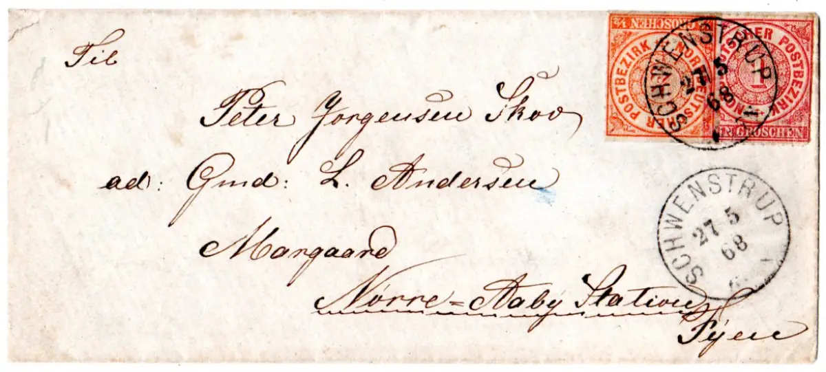 NDP 1868, nachverw Schleswig-Holstein-K1 Schwenstrup auf Brief m. 1/2+1 Gr n. DK
