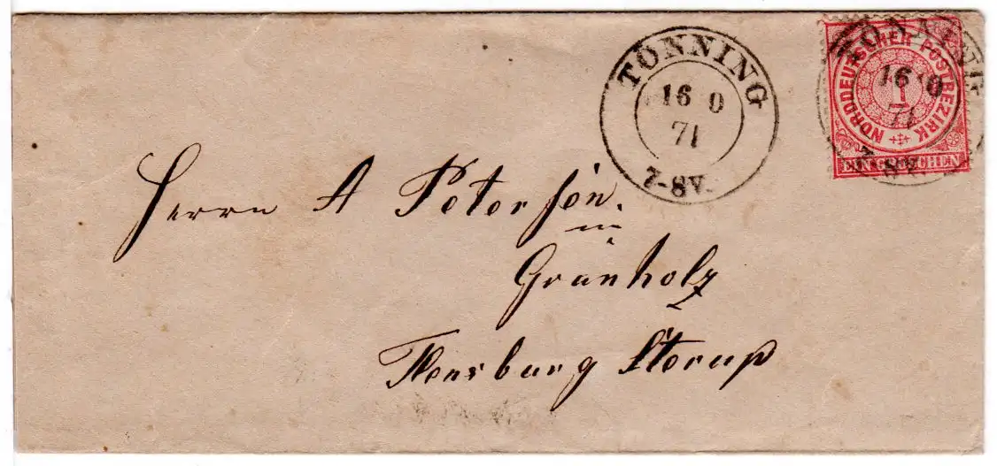 NDP 1871, nachverwendeter Preussen-K2 Tönning klar auf Brief m. 1 Gr.