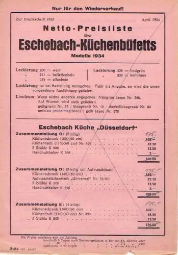 Netto-Preisliste für Eschebach-Küchenbüffets Modelle 1934.
