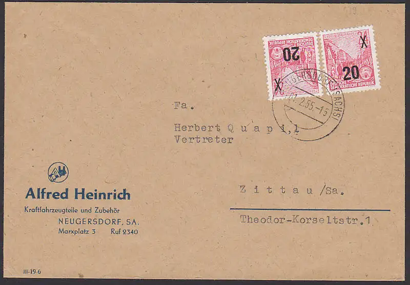 Neugersdorf Sachen 20 auf 24 Pfg. Doppelbrief Alfred Heinrich 1.2.55