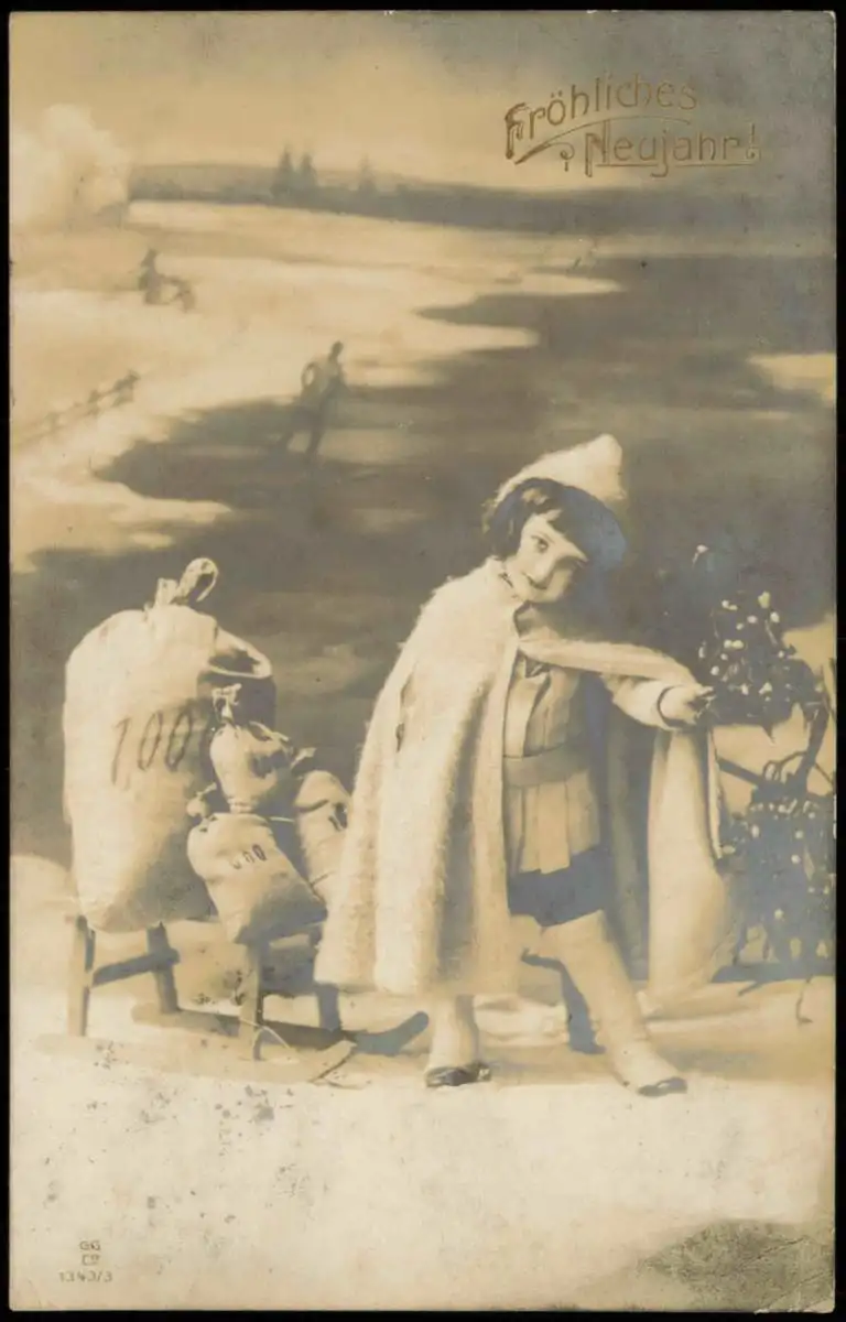 Neujahr Sylvester New Year Fotokunst Mädchen mit Schlitten Geldsäcke 1912