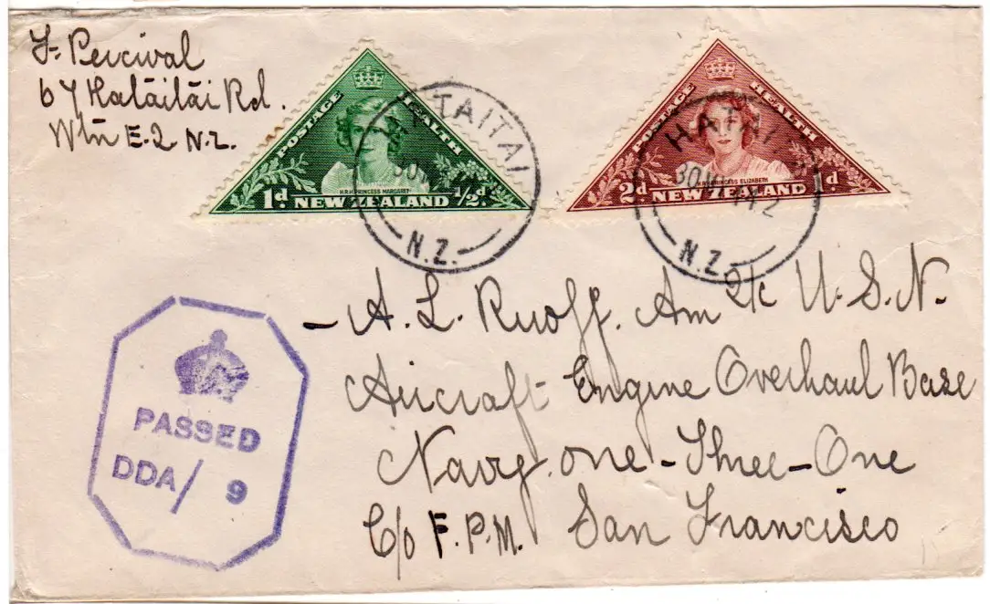 Neuseeland 1944, 1+2d Gesundheit Dreiecksmarken auf Zensurbrief n. USA