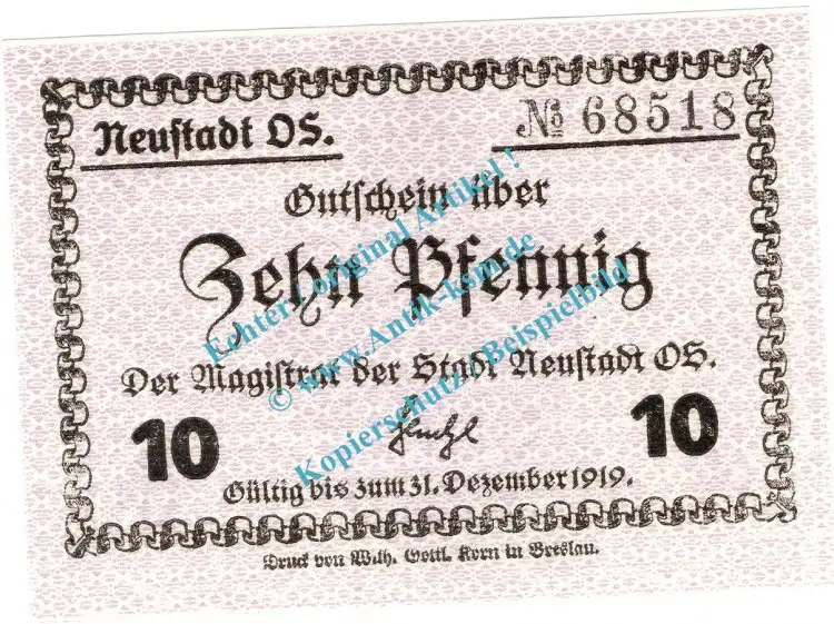 Neustadt OS. Notgeld 10 Pfennig Schein in kfr. Tieste 4960.20.05 , Oberschlesien o.D. Verkehrsausgabe