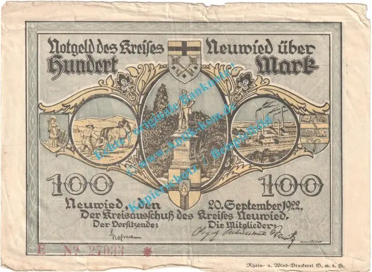 Gutschein / Banknote über Einhundert Mark , Kreis Neuwied , Großnotgeld 1922/23Bundesland : Rheinland  ,  Müller : 3305.4.b