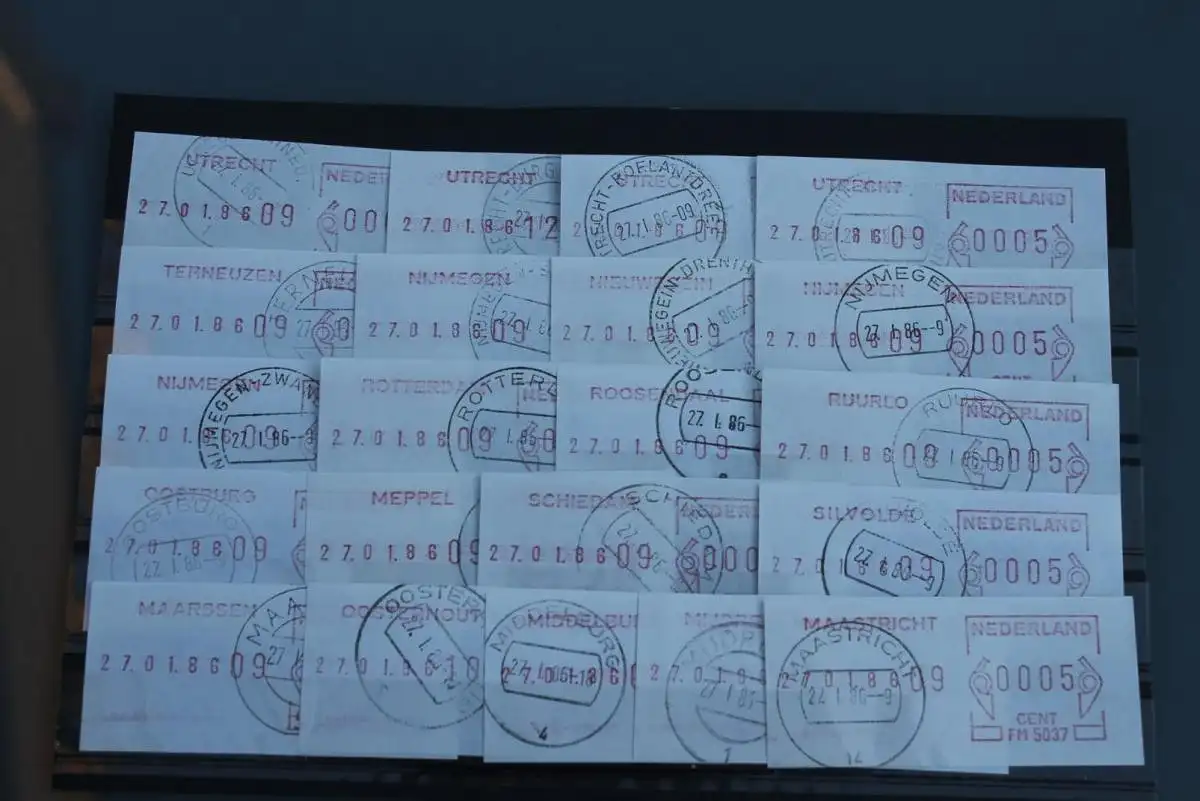 Niederlande,Schalter-ATM,ATM-Vorläufer;Frankierlabel,21 Verschiedene:Utrecht-Maastricht,Ersttag:27.1.86, Ersttag