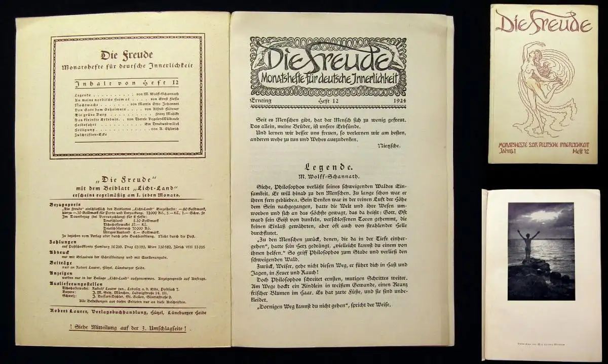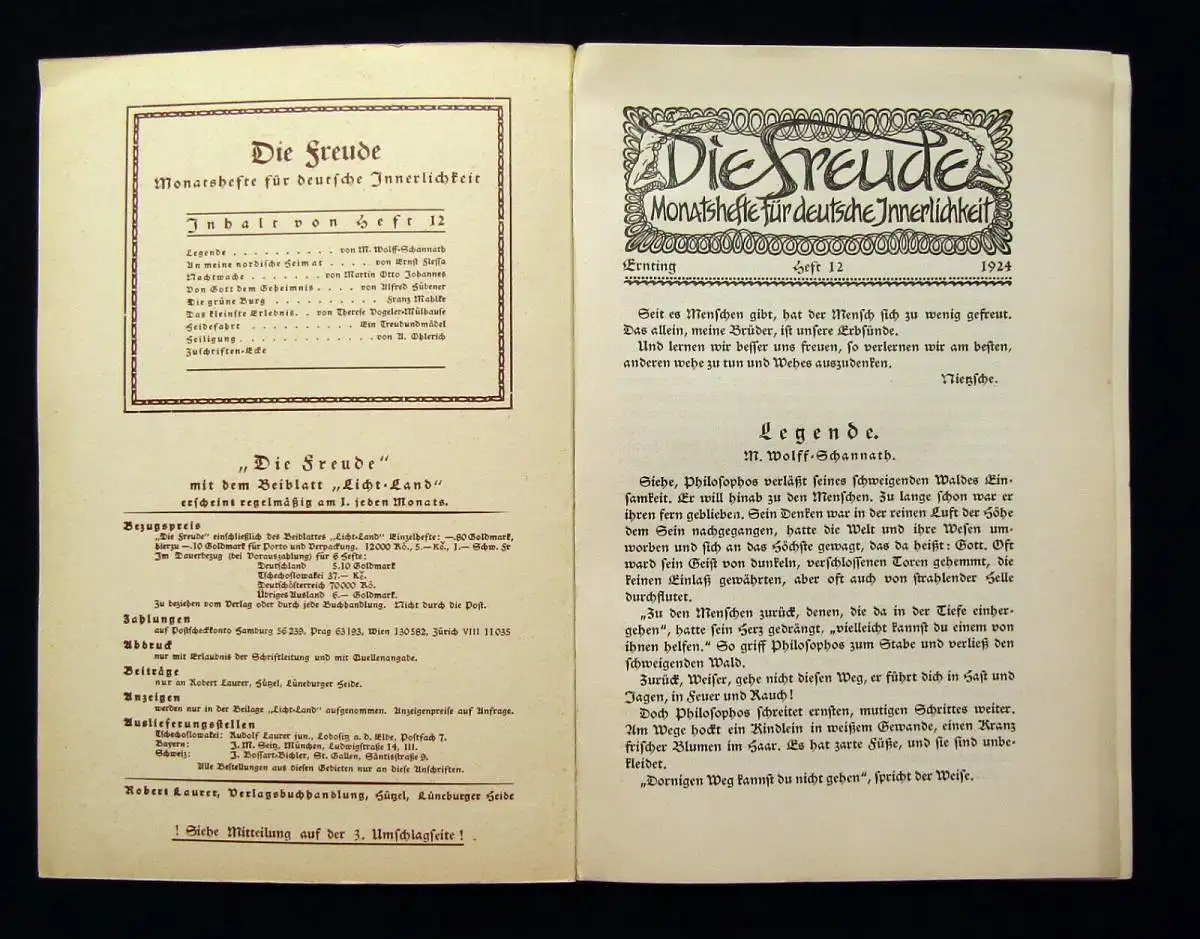 Inhalte: Legende, an meine nordische Heimat, Nachtwache, Von Gott dem Geheimnis, Die grüne Burg, Das kleinste Erlebnis, Heidefahrt, Heiligung, Zuschriften- Ecke