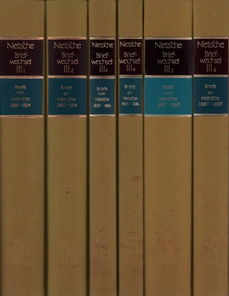 [1.] Briefe von Nietzsche, Januar 1880 - Dezember 1884. - [2.] Briefe an Friedrich Nietzsche, Januar 1880 - Dezember 1884. - [3.] Briefe von Nietzsche, Januar 1885 - Dezember 1886. - [4.] Briefe an Friedrich Nietzsche, Januar 1885 - Dezember 1886. - [5.] Friedrich Nietzsche, Briefe, Januar 1887 - Januar 1889. - [6.] Briefe an Friedrich Nietzsche, Januar 1887 - Januar 1889. - Die Einbandrücken im unteren Bereich stockfleckig, sonst gut