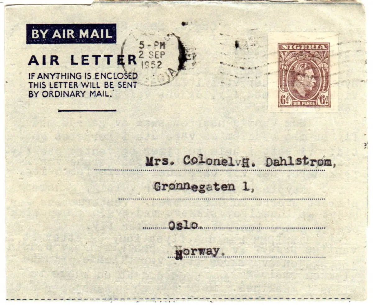 Nigeria 1952, 6d Air Letter stationery sent from Lagos to Norwegen.