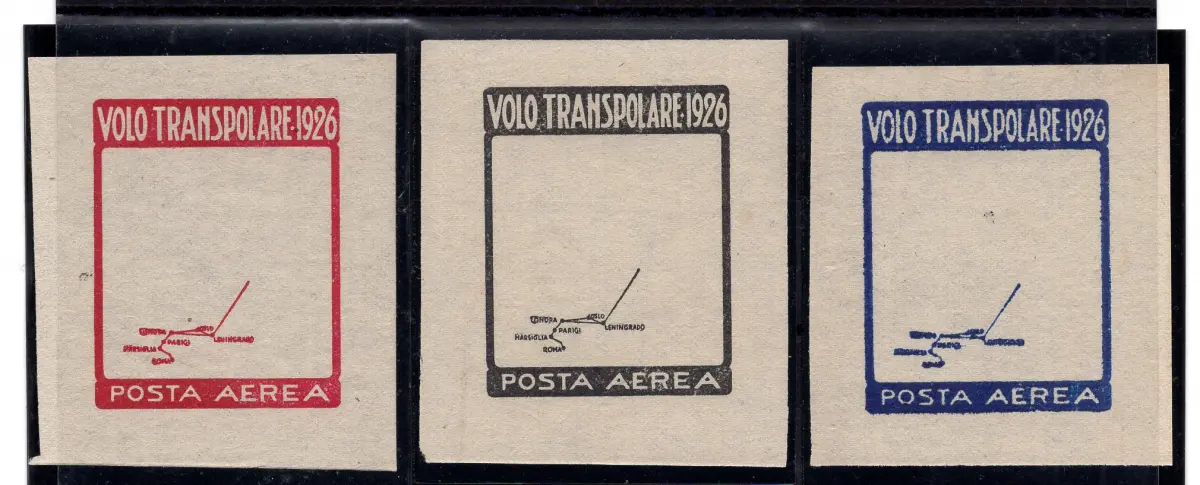 Rahmen des Erinnophilen, der dem transpolaren Flug von 1926 gewidmet ist - Wahrscheinliche Druckversuche in Schwarz (angewandte Farbe), Blau und Rot des Rahmens allein - drei ungezahnte Exemplare - Perfekter Vollgummi - Unveröffentlicht und selten Cod. 4039/Web