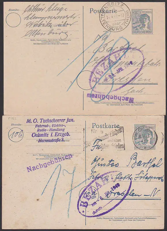 Nobitz ber Altenburg, Chemnitz 2 GA mit Nachgebhr, dabei vom 30.6.48 als Zehnfach mit 1 Pfg. angerechnet
