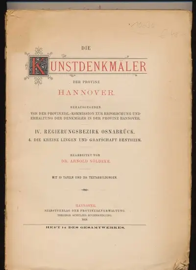 Titel: Die Kunstdenkmäler der Provinz Hannover. Band IV: Regierungsbezirk Osnabrück. Teil 4: Die Kreise Lingen und Grafschaft Bentheim. (Heft 14 des Gesamtwerkes) Herausgegeben von der Provinzial-Kommission zur Erforschung und Erhaltung der Denkmäler in der Provinz Hannover. (Bearbeitet von Dr. Arno)