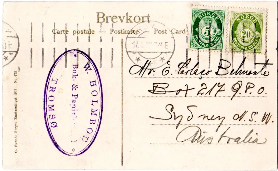 Norwegen 1920, 5+20 öre auf Spitzbergen Polar-AK v. Tromsö n. Australien