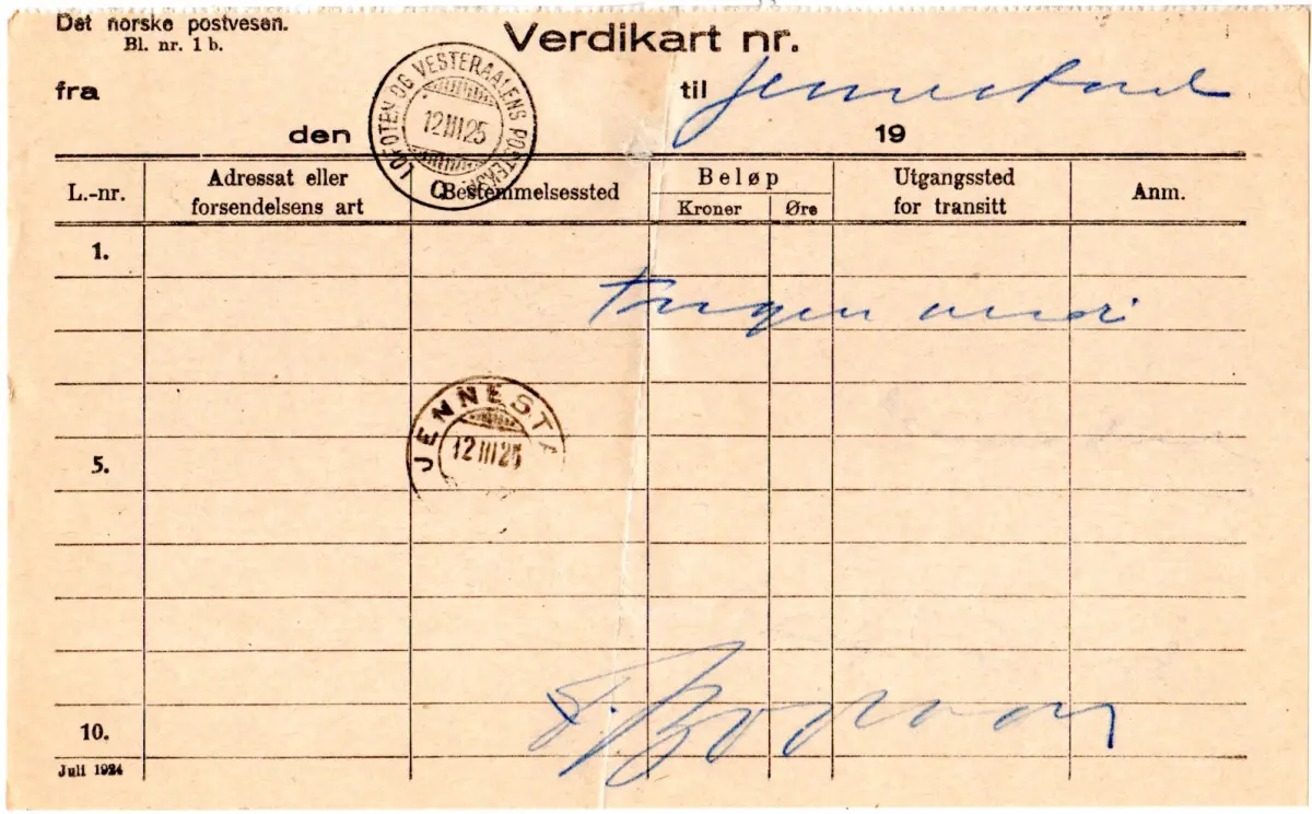 Beim Schiffspostkontor Lofoten og Vesteraalen Posteksp. verwendetes Verdikart Postformular. Formular m. senkr. mittiger Faltung, siehe scan.