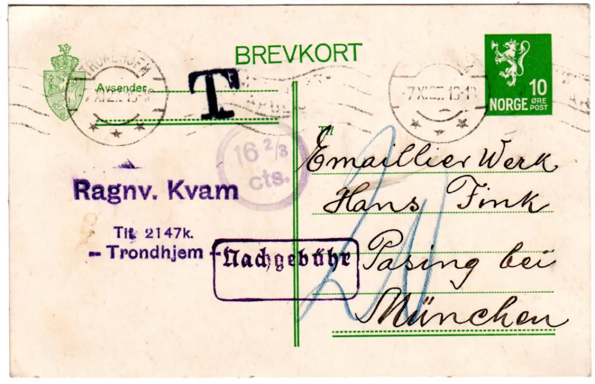 Norwegen 1927, 10 öre Ganzsache v. Trondhjem n. Pasing m. T u. Nachgebühr-Stpl.