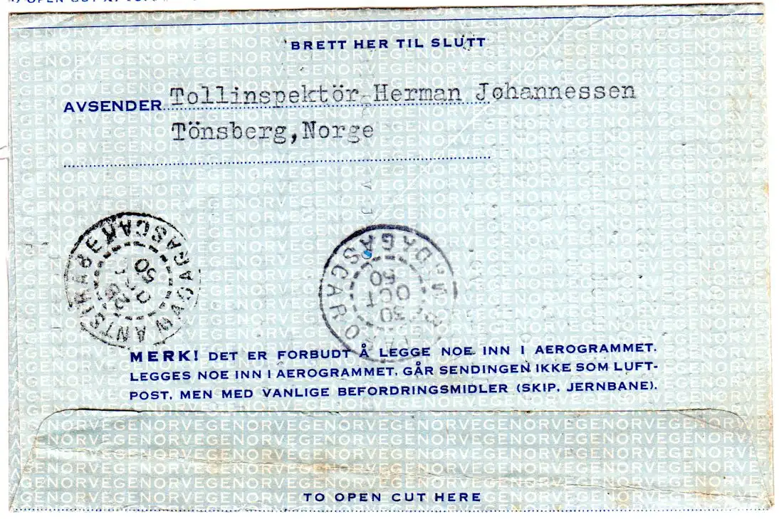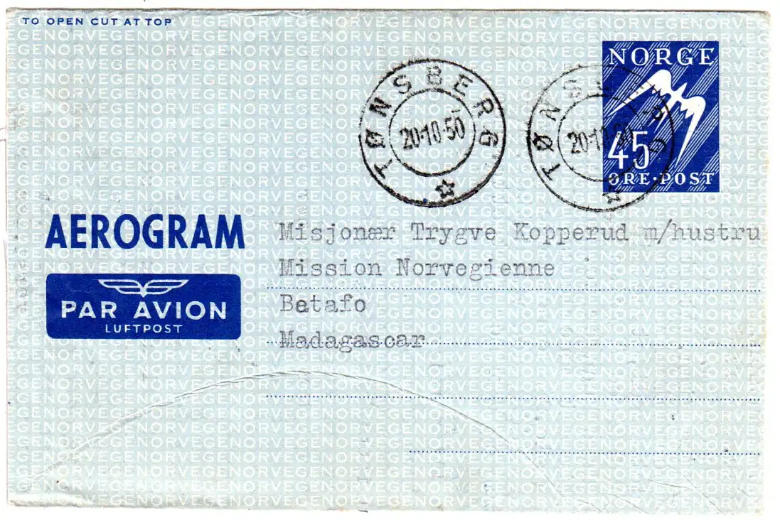 Norwegen 1950, 45 öre Aerogram v. Tönsberg n. Madagascar