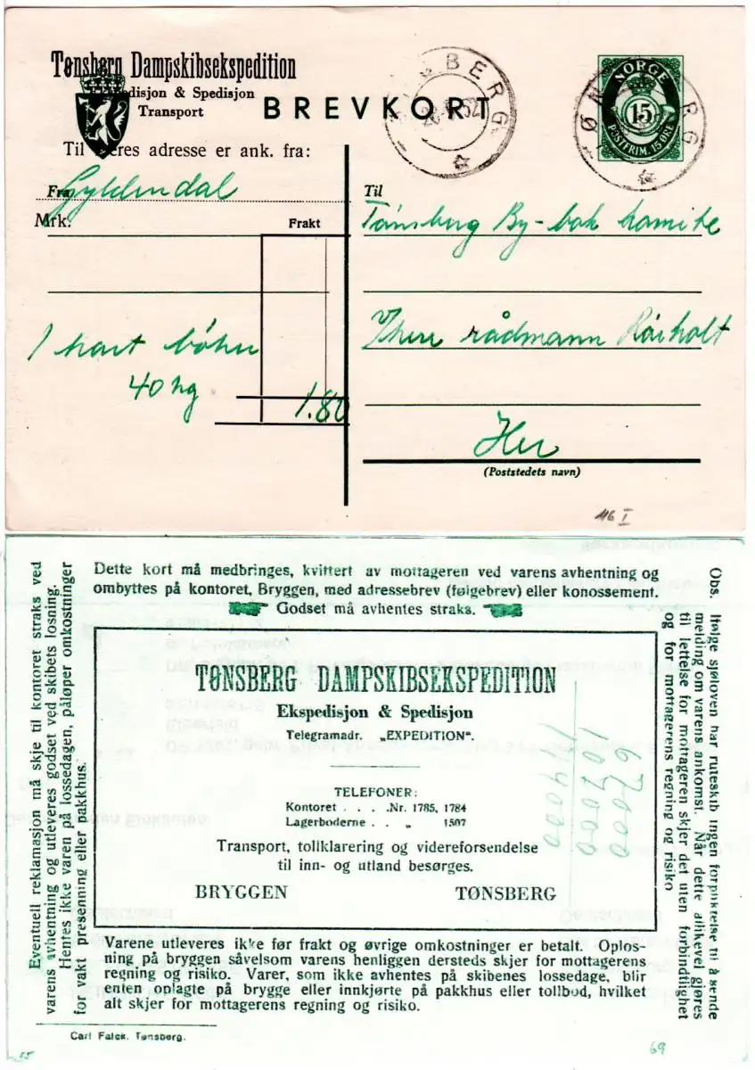 15 öre Ganzsache (Aune 116 I) in Tönsberg Ortsverwendung. Vorder- u. rücks. Zudruck der Tönsberg Dampfschiffsexpedition.
