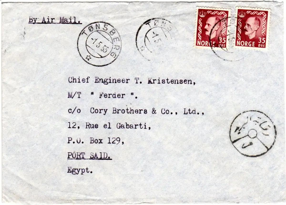 Norwegen 1955, MeF 2x35 öre auf Luftpost Brief v. Tönsberg n. Port Said, Ägypten