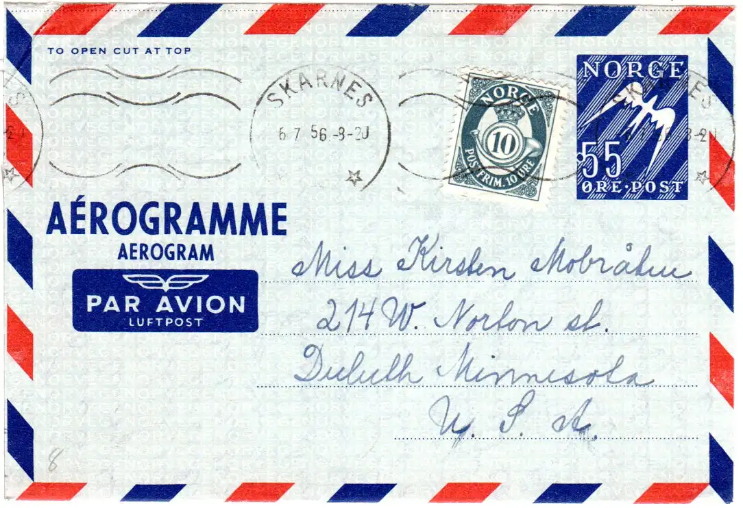 Norwegen 1956, 10 öre on 55 öre Aerogramme stationery from Skarnes to US