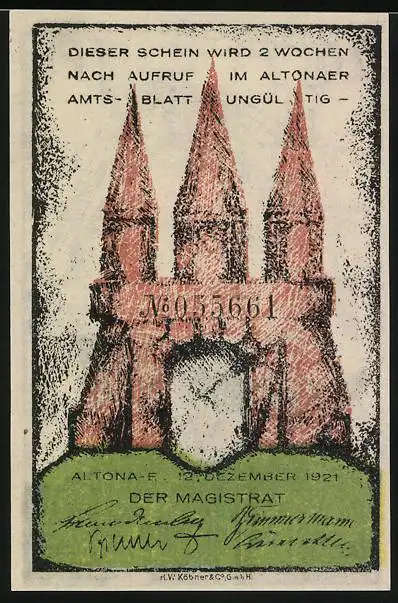 Notgeld Altona, 1921, 20 Pf, Segelschiff und dreitürmiges Gebäude