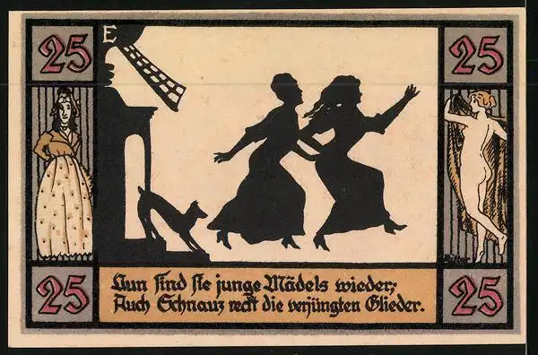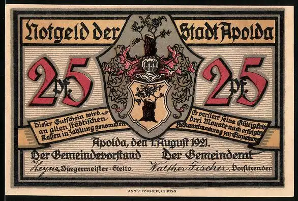 Notgeld Apolda 1921, 25 Pfennig, Wappen, zwei junge Mädels mit Schnauz