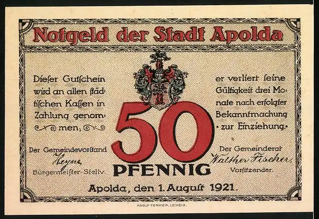 Notgeld Apolda, 1921, 50 Pfennig, Text mit Webstuhl und Stadtwappen