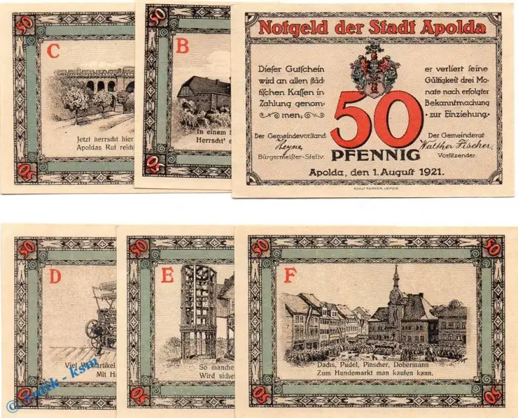 Notgeld Apolda , Stadtansichten , Set mit 6 Scheinen in kfr. orange , Mehl Grabowski 36.3 b , von 1921 , Thüringen Seriennotgeld
