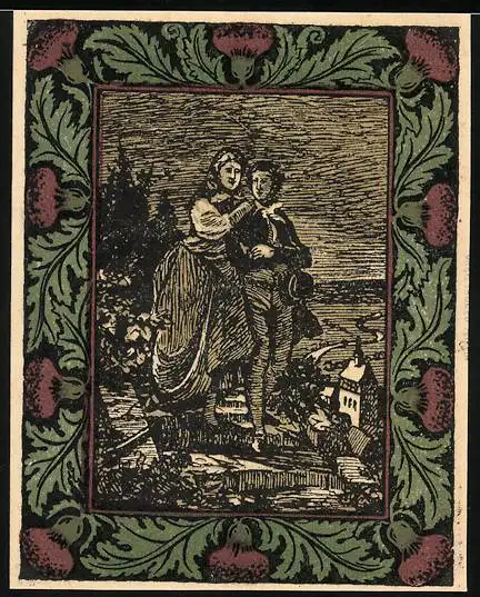 Notgeld Artern 1921, 50 Pfennig, Gedenkblatt mit Paar und Gebäuden, Silhouette Goethe