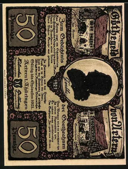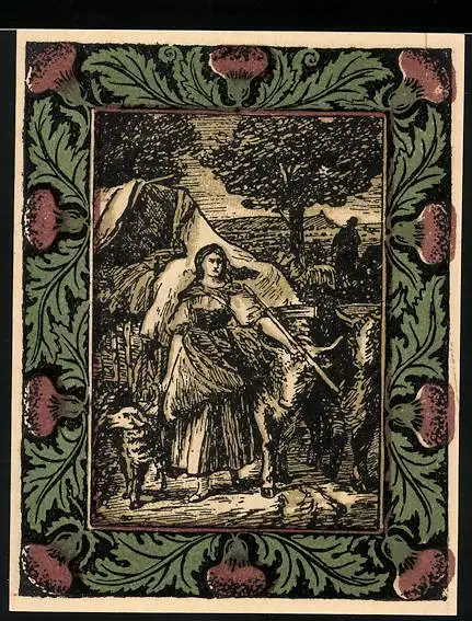 Notgeld Artern 1921, 50 Pfennig, Ziegenhirtin Portrait und Goethe Gedenkprägung