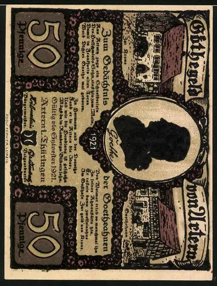 Notgeld Artern i. Thüringen 1921, 50 Pfennig, Gasthaus zur Krone, Goethehaus