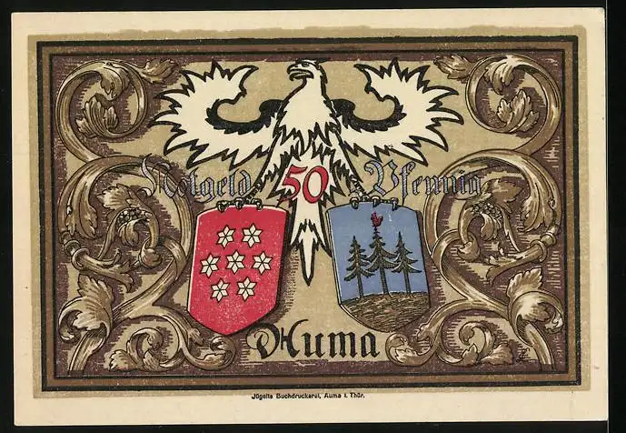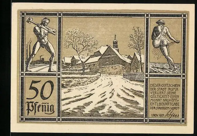 Notgeld Auma 1921, 50 Pfennig, Stadtansicht im Winter und zwei Arbeiter, Wappen und Adler auf der Rückseite