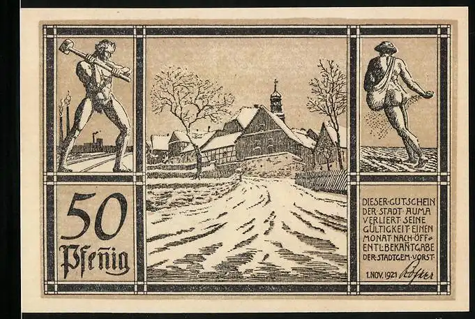 Notgeld Auma 1921, 50 Pfennig, Stadtwappen, Arbeiter & Bauer, Stadtansicht