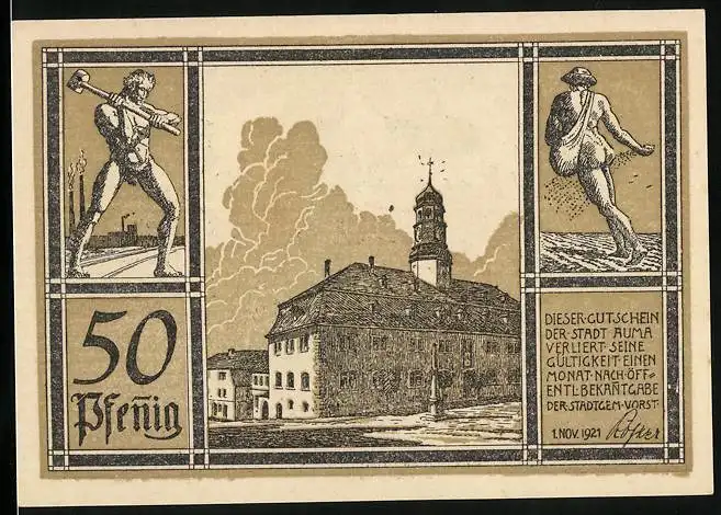 Notgeld Auma 1921, 50 Pfennig, Stadtwappen, Arbeiter & Bauer, Stadtansicht